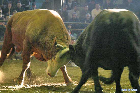 新チャンピオンの座に着いた嶺山号の牛主と応援団
