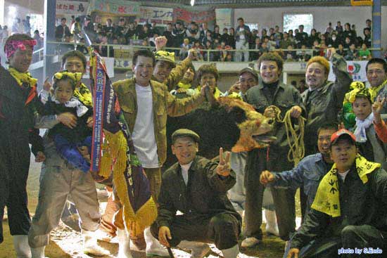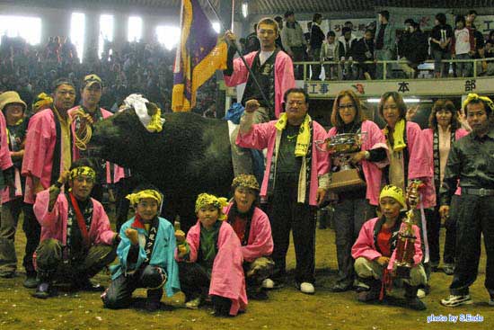 タイトル防衛を喜ぶ電光石火里伊奈号の牛主と応援団