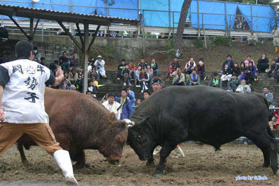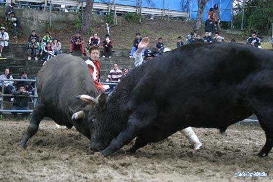 攻める赤、踏ん張る恭平号。場内からは両牛に対する声援が飛び交う。