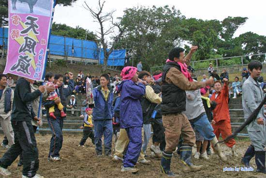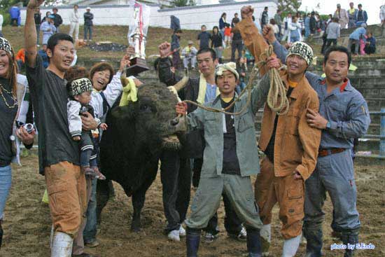 勝利に沸く双竜武蔵恭平号の牛主と応援団