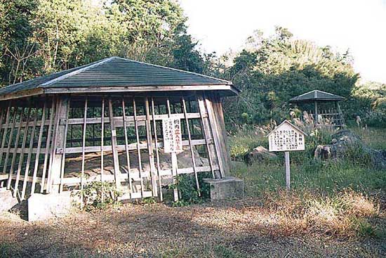 天城町秋利神川上流の南岸の山中戸森に東と西に約21m隔てて、三畳敷ほどの白いキャンパスを拡げたような二個の巨岩が横たわっている.鉄利器によって数多くの船、矢が掘り込まれている二束位のものを第一線刻画、西位のものを第二線刻画と言っているcこのような岩が三京、馬根、大田布丘山頂母間にもあり、二の外末確認のものもあると言われている〔国内では沖縄、北海道フゴッペ洞穴、国外ではフィラデルフィア、スカンズナビア半島、パルチック海、デンマーク、スエーデン、アムール河流城、韓国にもある。近年琉球大学本村氏、神戸商船大学松本氏、同志社大学の森氏等の調査研究によりこの遺跡の重要性が指摘され、町教育委貝会では梅光大学国分直一氏に調査を依頼したcその結果、予測的所児として、船や矢を岩刻した動機は、新築家屋の操上げの際、悪霊の近寄るのを防ぐために戸ブと矢を組んで棟上げにかかげるのと同意味で呪術的願望達成が動機であろうとしている,刻画に使用した道具は鉄利器で、刻画した人は島人(秋利神川周辺の住人)で、線刻画の刻画の時期は、グスク時代をめぐる時期ではなかったであろうか。一としている。(説明文:天城町役場「文化財のしおり」より引用) |
